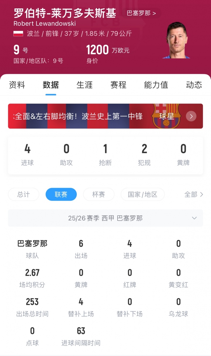 莱万现年37岁,他本赛季于今为巴萨出战6场西甲,打进4球,现身价1200万欧,他与巴萨的条约将于来岁到期。