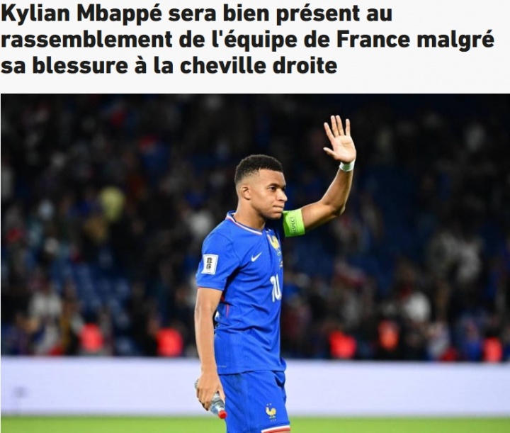 10月05日讯 据法媒《队报》音书,尽管在本轮西甲皇马3-1黄潜的比赛中脚踝受伤,但姆巴佩瞻望仍会前去本期法国国度队报到。