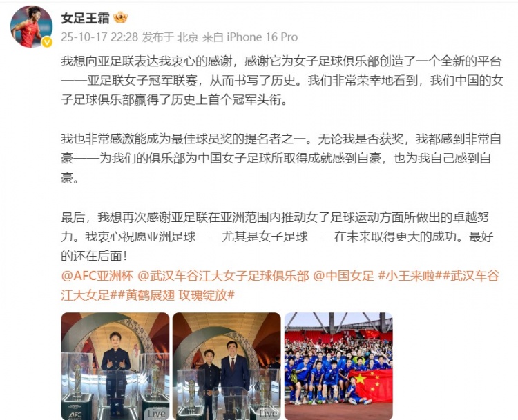 10月17日讯 亚足联年度受奖仪式放胆,王霜无缘年度最好女足球员奖项。尽管如斯,王霜仍在个东谈主酬酢媒体发文致谢亚足联。
