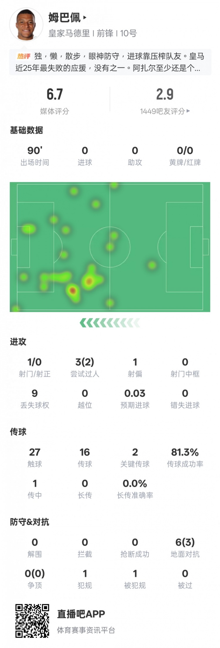 姆巴佩本场比赛数据:0射正2过东说念主得胜2要道传球,评分6.7