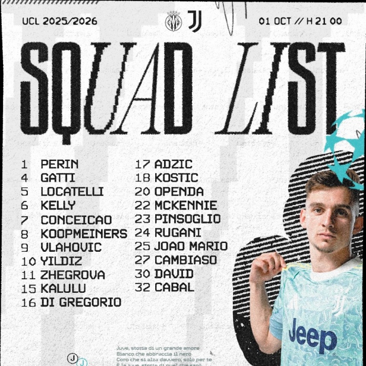 9月30日讯 北京技能10月2日凌晨3时,欧冠联赛第2轮尤文图斯将在客场对战比利亚雷亚尔。本日尤文公布了本场比赛的21东谈主名单,弗拉霍维奇、伊尔迪兹、戴维、热格罗瓦领衔。