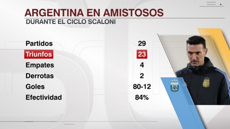 据ESPN统计,斯卡洛尼握教阿根廷以来带队干涉29场友谊赛,战绩23胜4平2负,打进80球丢12球。