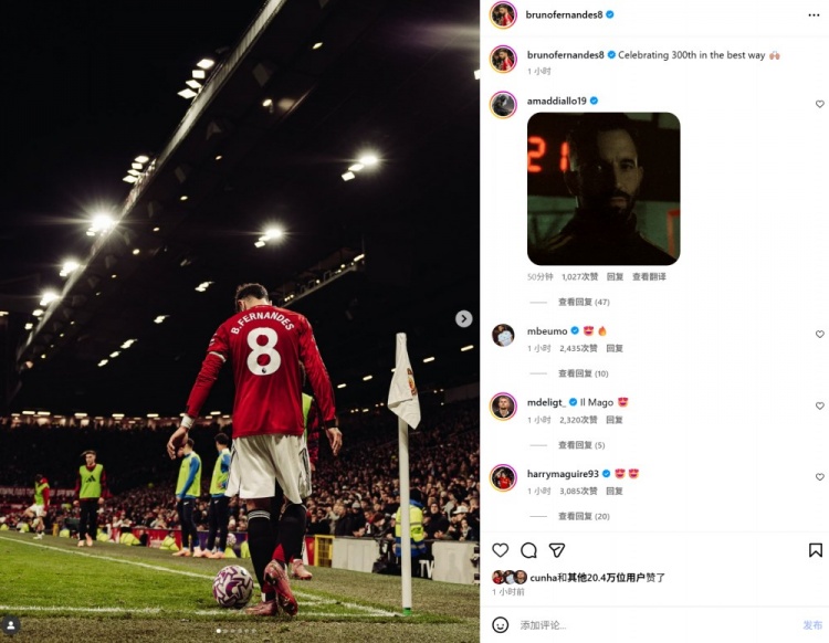 本场比赛B费也迎来个东谈主曼联活命300次出场里程碑,他也在个东谈主社媒晒出本场相片,配文写谈:“以最棒的神气顾虑300场里程碑!”