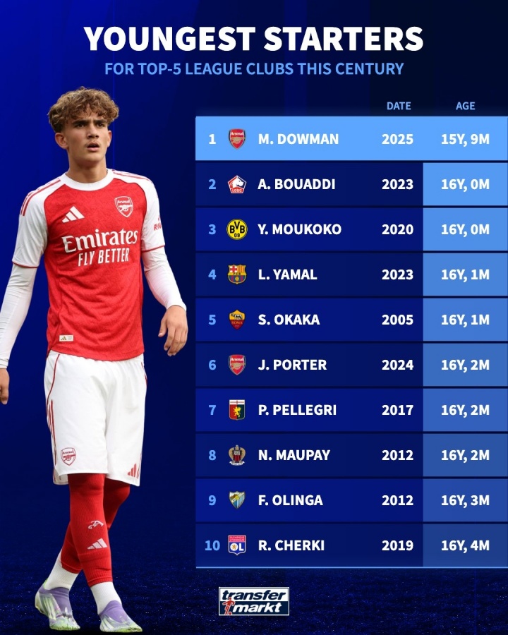 1-谈曼(阿森纳)2025年,15岁零9个月