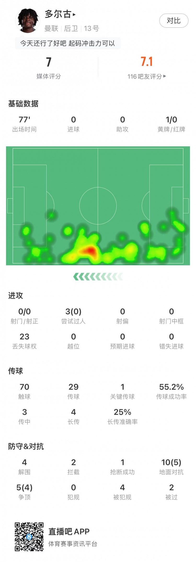 本场多尔古在防患端弘扬积极,他在77分钟里留住4次突围、2次阻拦、1次抢断的出色数据,10次大地抵御有5次告捷,5次高空争顶有4次告捷。