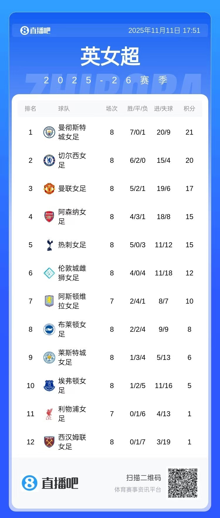 11月11日讯 本赛季女足英超仍是战罢8轮,最新积分榜情况如下: