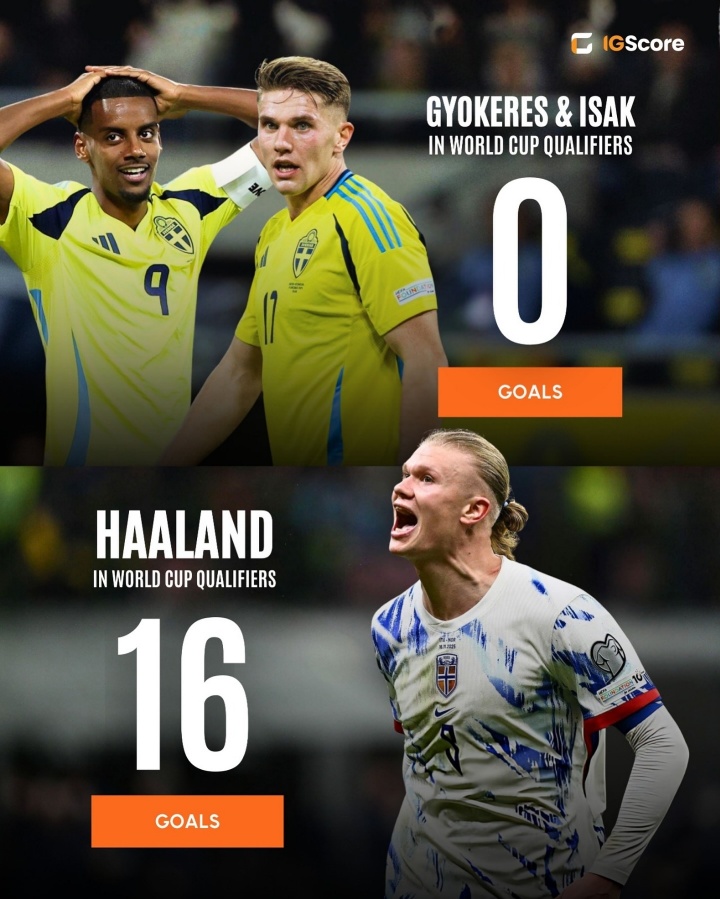 层次差距?哈兰德8场16球头名进天下杯,瑞典2.7亿锋线4场1球垫底
