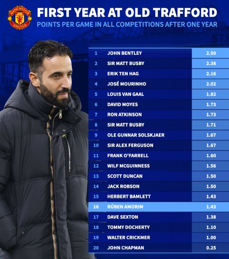 11月25日讯 《转会阛阓》统计了阿莫林入主老特拉福德握教第一年的场均拿分情况,1.43分仅能位排队史第16位。