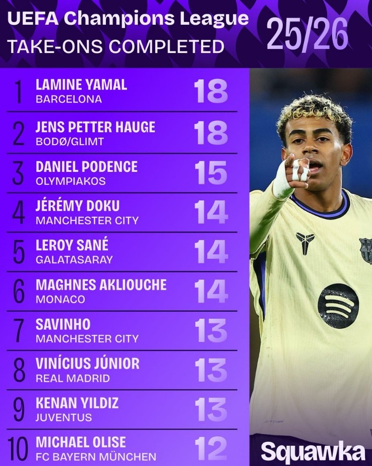 本赛季欧冠告捷过东谈主次数榜:亚马尔18次居首,多库、萨内在列