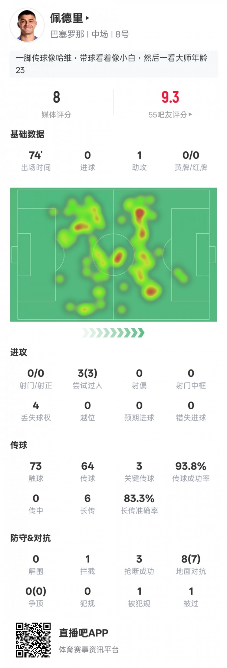 12月3日讯 2025-26赛季西甲联赛第19轮,巴萨主场迎战马竞。佩德里首发出战,送出1次助攻,3次枢纽传球,3次过东说念主均见效,传球见效劳93.8%,评分8.0。