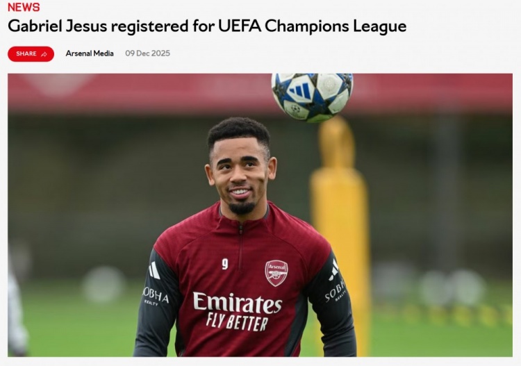 12月9日讯 阿森纳官方音信,球队先锋热苏斯也曾注册,他将参加本赛季的欧冠比赛。