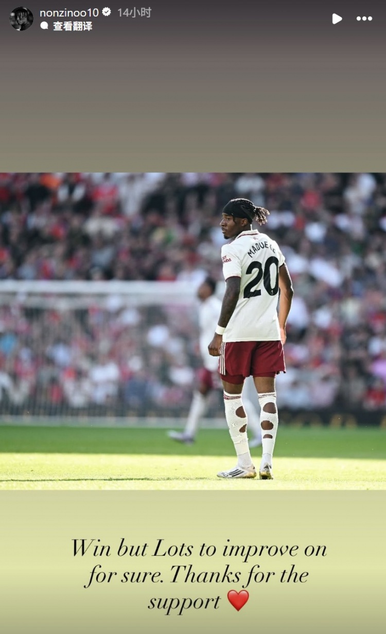 本场比赛阿森纳新援马杜埃凯替补登场,赛后他也在个东说念主社媒晒出本场相片,配文写说念:“天然赢得凯旋,可是改日还有好多场地需要擢升,感谢各人的辅助!”