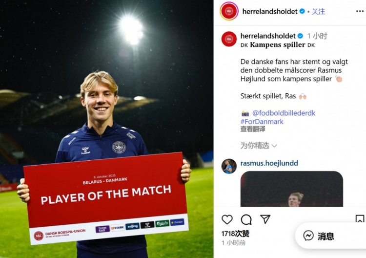 2球1助攻!官方:霍伊伦当选丹麦6-0白俄罗斯队内最好球员