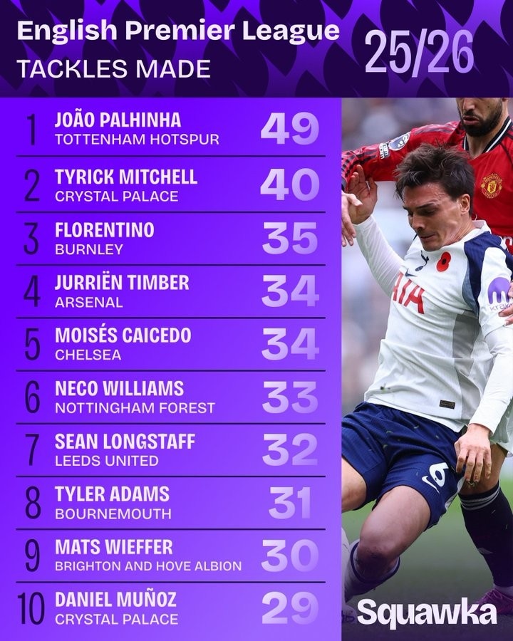 1.若昂·帕利尼亚,托特纳姆热刺,49次