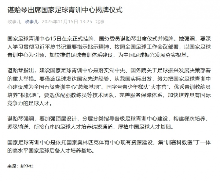 国度足球青训中心15日在京提神挂牌,国务委员谌贻琴出席典礼并揭牌。她强调,要深切学习贯彻习近平总文书进犯推敲批示精神,按照世界足球责任会议部署,以国度足球青训中心为引颈,加速鼓励足球青训体系成就,为中国足球振兴发展夯实根基。