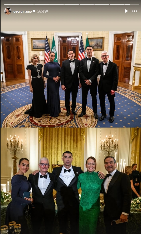 图中C罗、乔治娜与苹果公司CEO库克等东说念主合影。