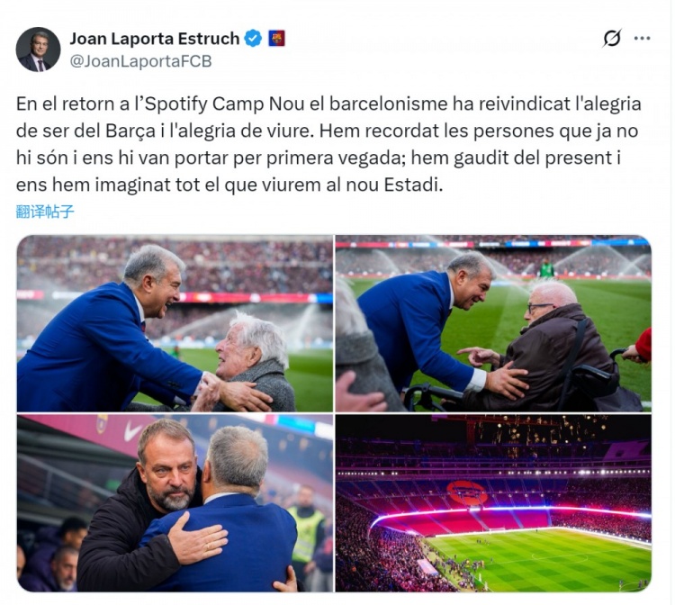 巴萨俱乐部主席拉波尔塔在交代媒体上写说念:“在重返坎普诺的这一天,巴萨球迷们从头找回了身为巴萨东说念主的本旨与怡悦。”