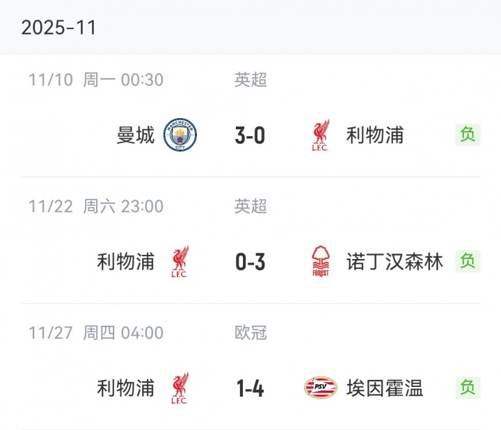 在这三场比赛中,利物浦均净丢3球(0-3曼城、0-3丛林、1-4埃因霍温),共丢10球。