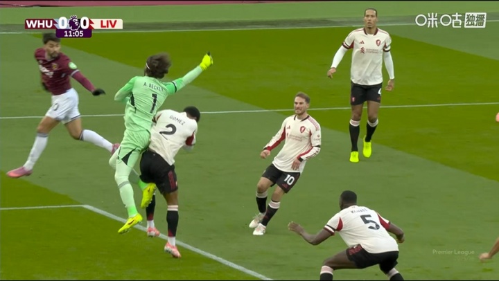 11月30日讯 英超第13轮,西汉姆联vs利物浦,比赛第12分钟,阿利松出击与戈麦斯相撞,倒地后队医进场调养,随后比赛延续。