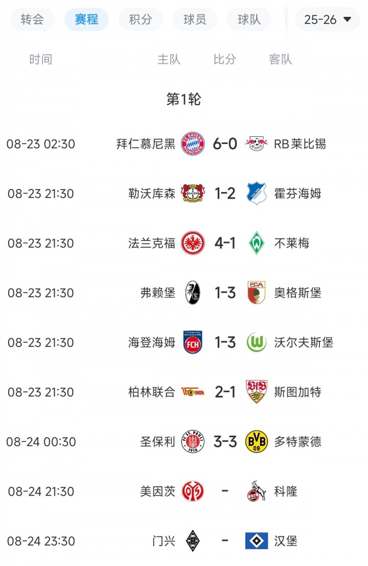 德甲首轮战罢多场,拜仁6-0大捷劲旅莱比锡,确凿锁定首轮榜首。反不雅其他强队,翻车一大堆。