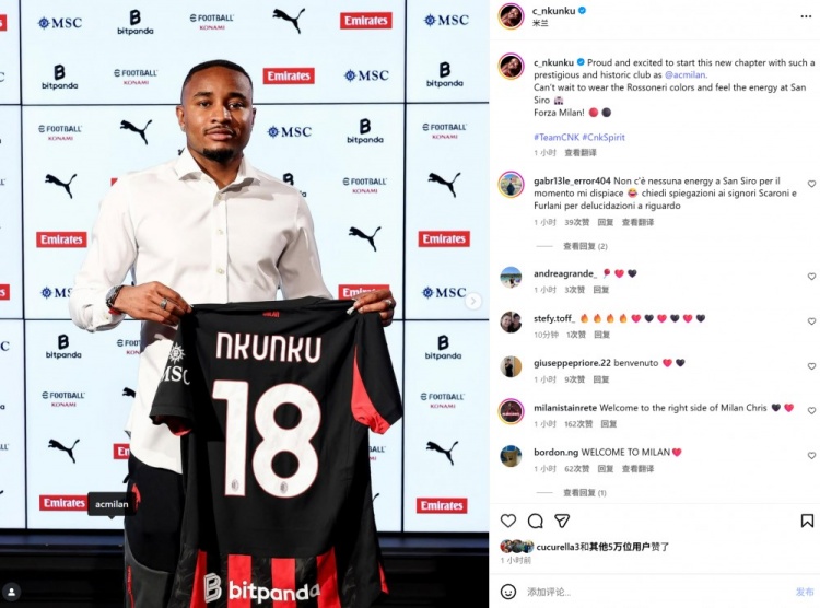 恩昆库在社媒配文写谈:“畸形庆幸且振作大约与如斯享有殊荣和历史悠久的俱乐部开启新篇章。迫不足待思要穿上红黑战袍,在圣西罗球场感受到那份厚谊。米兰加油!”