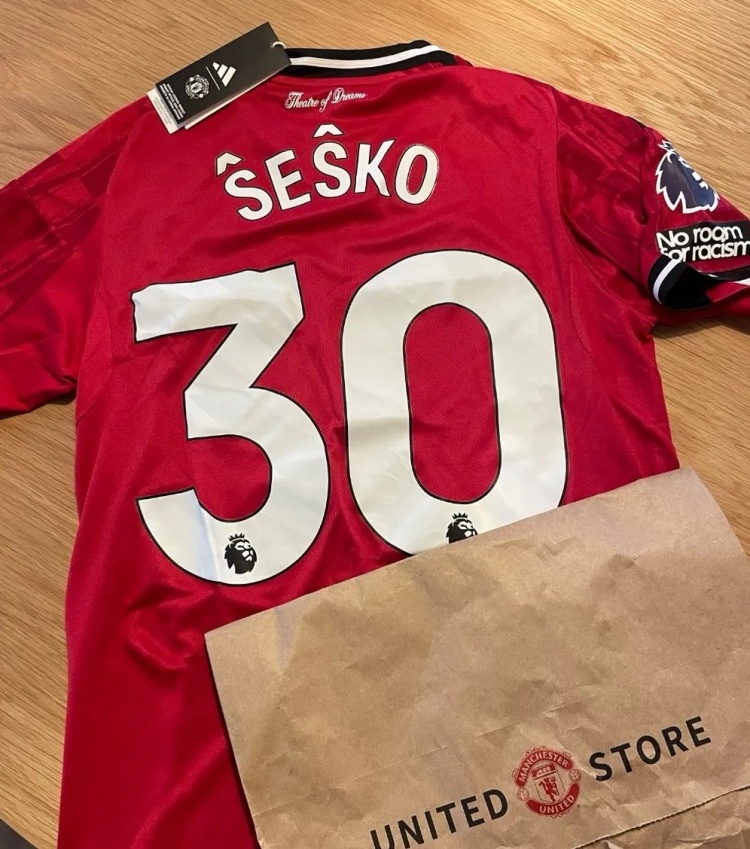 球迷Jaka在社媒上暗示,我方从曼联官方在线商店购买了舍什科的30号球衣,发现舍什科姓氏中的变音标志被倒置,两个向下的箭头向上。
