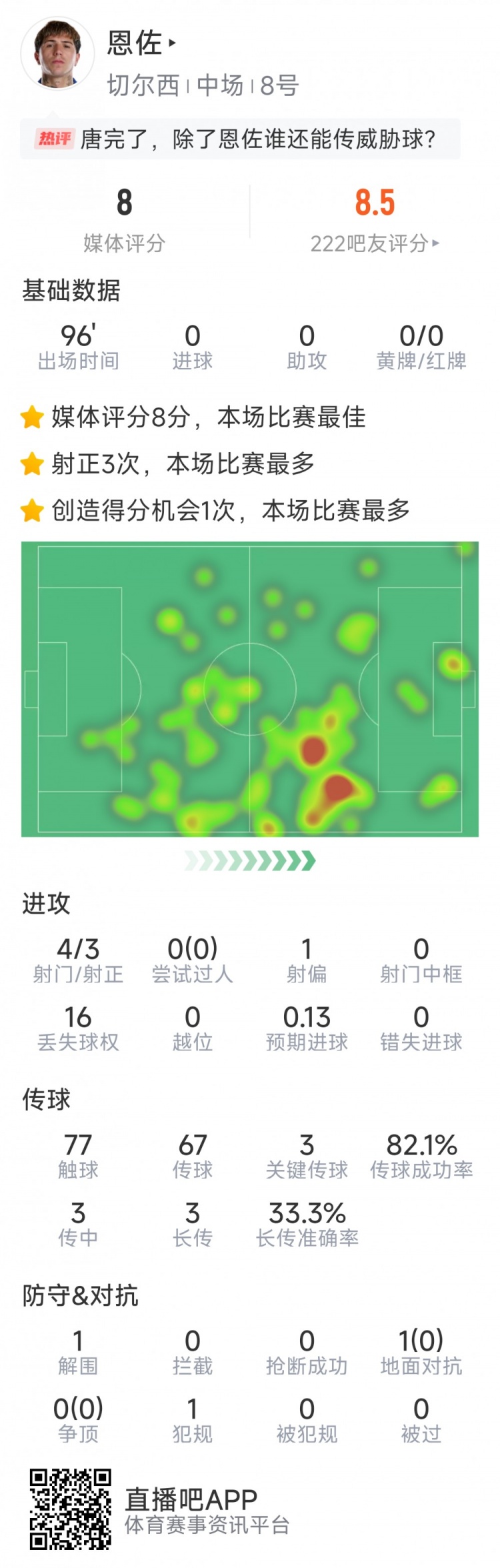 难挽败局,恩佐本场数据:3次要津传球,4射3正,评分8分全场最高