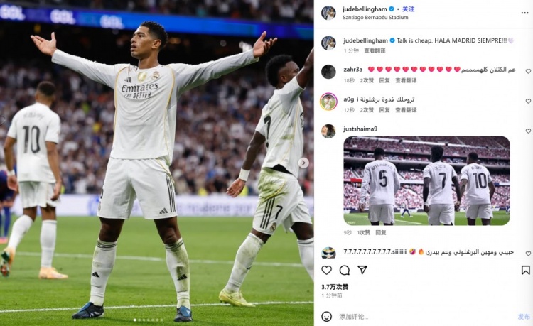 抵挡亚马尔!贝林厄姆传射立功,社媒晒霸气庆祝照:语言是低价的