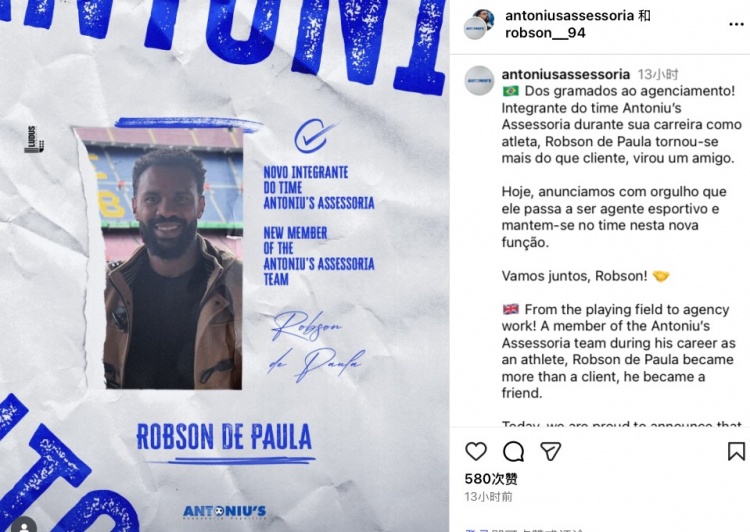 10月31日讯经纪公司Antoniu’s Assessoria当天官方晓谕,前大连英博外助罗伯森加盟,成为该公司旗下牙东说念主。