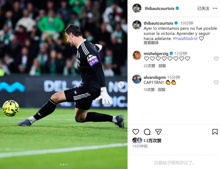 皇马门将库尔图瓦社媒晒出比赛相片,配文:“昨天咱们拼尽全力,但未能取得得胜,咱们会吸取警戒,延续前进。”