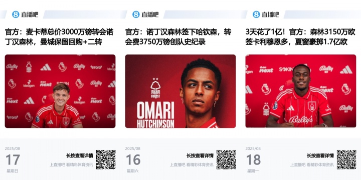 此前诺丁汉丛林在8月16日一经官宣签下哈钦森和麦卡蒂,加上卡利穆恩多,丛林在3天内蹧跶了普及1亿欧元。本年夏窗,诺丁汉丛林在转会市集上一经参加普及1.7亿欧元。