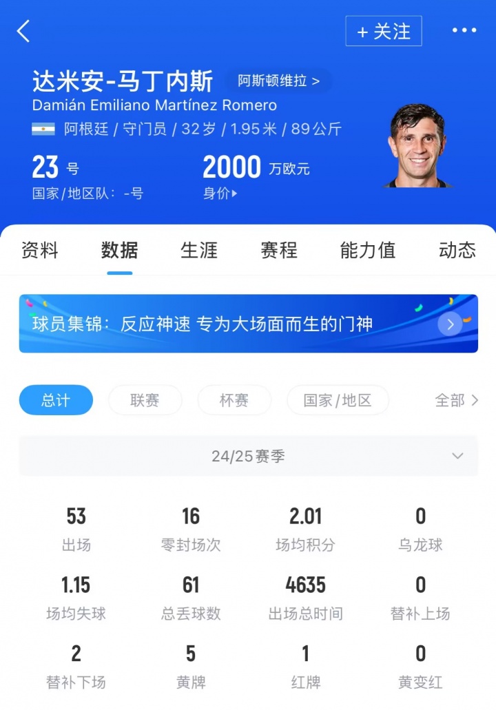 马丁内斯现年32岁,阿根廷门将。当今球员德回身价为2000万欧元。