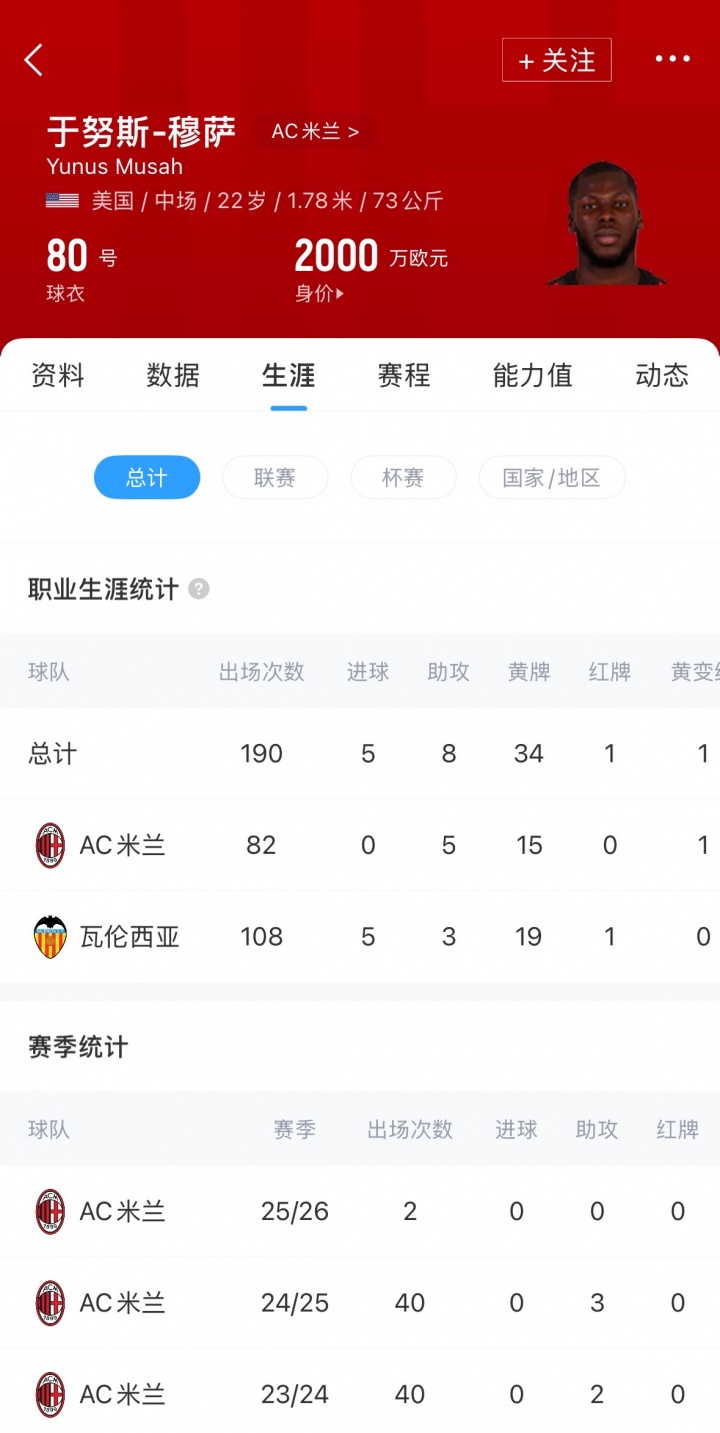穆萨现年22岁,司职中场,加盟米兰后球员计较出场82次,孝顺5助。现在穆萨德回身价为2000万欧元。
