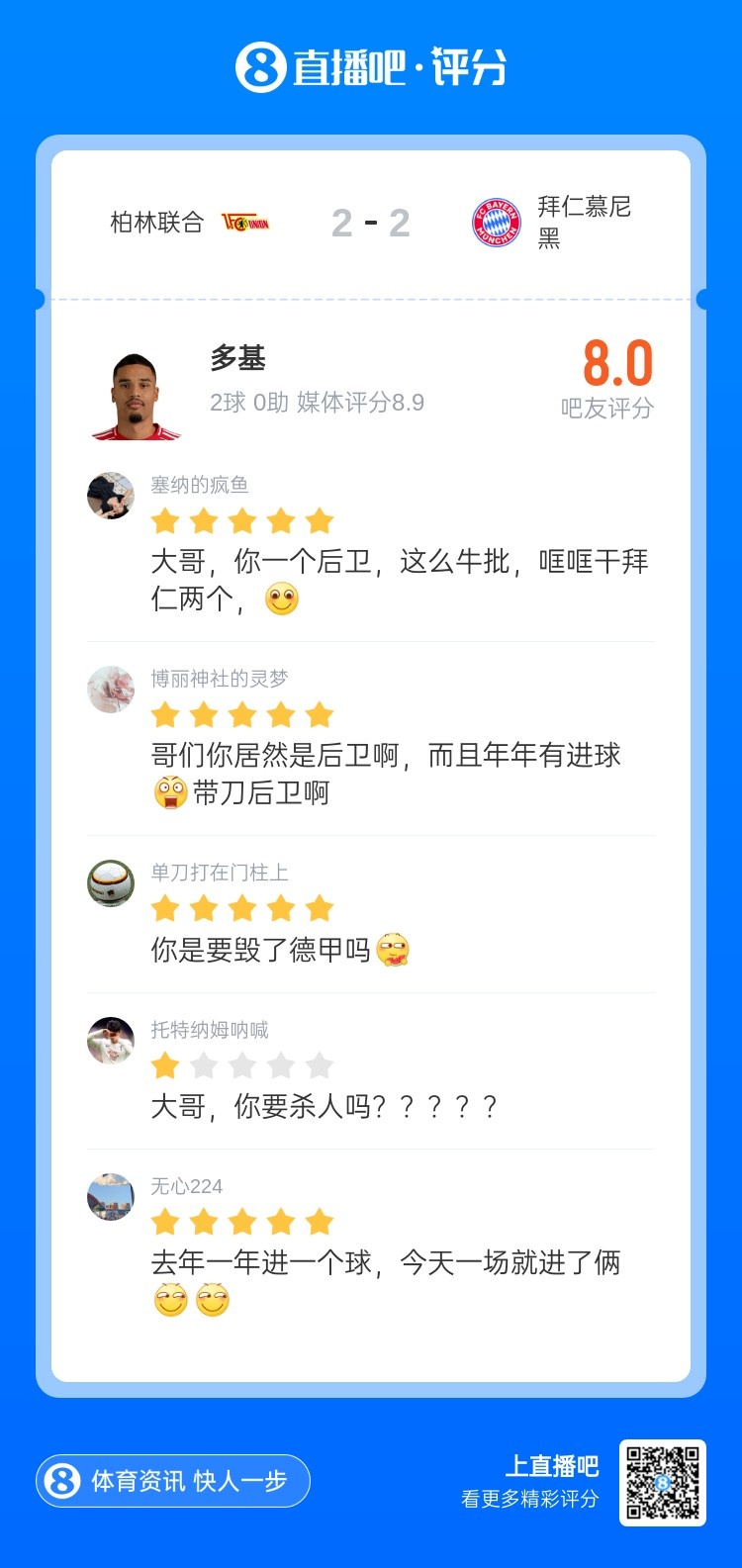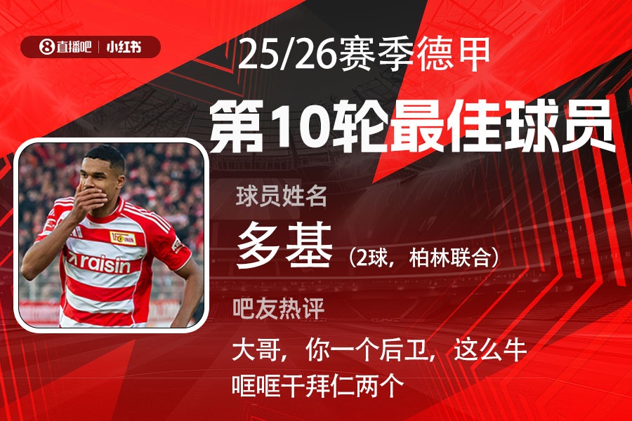 第十轮评比效劳结出炉,柏林辘集结卫多基梅开二度,匡助球队2-2战平拜仁,闭幕后者开局16连胜记载,当选【X小红书德甲第10轮最好球员】!