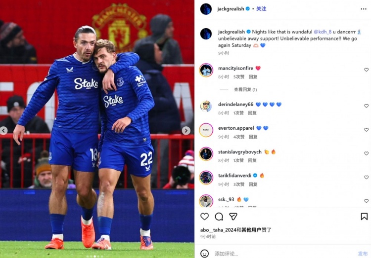 格拉利什也在赛后通过社媒晒出和进球元勋霍尔的合照,并配文:“这么的夜晚真实太棒了!@霍尔,你真实个舞者🕺🏻远征球迷们太棒了!难以置信的施展!!咱们周六再战!”
