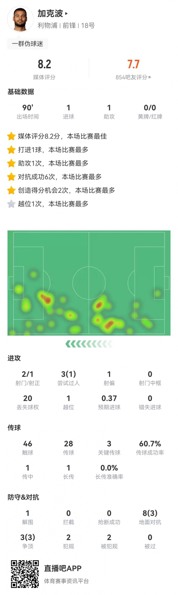 加克波本场2射1正进1球 1助攻+3关键传球 20丢失球权+11扞拒6收效