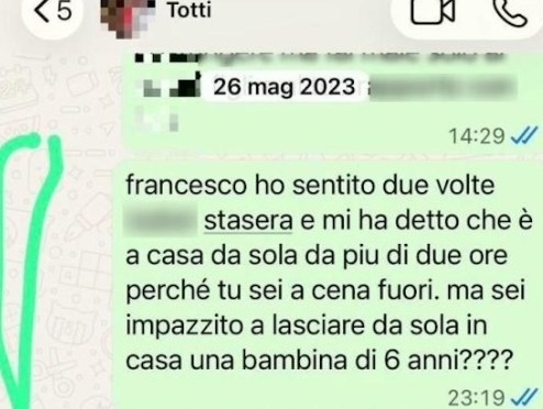晚上11点19分,她给托蒂发了一条信息:“弗朗切斯科,我今晚两次联系了咱们的男儿,她说你也曾出门就餐稀薄两个小时,把她一个东谈主留在家里。你疯了吗?尽然让一个六岁的孩子独安详家?”之后,布莱西条件她的母亲报警。最终,她决定对前夫荒谬新伴侣忽视罢休未成年东谈主的指控。