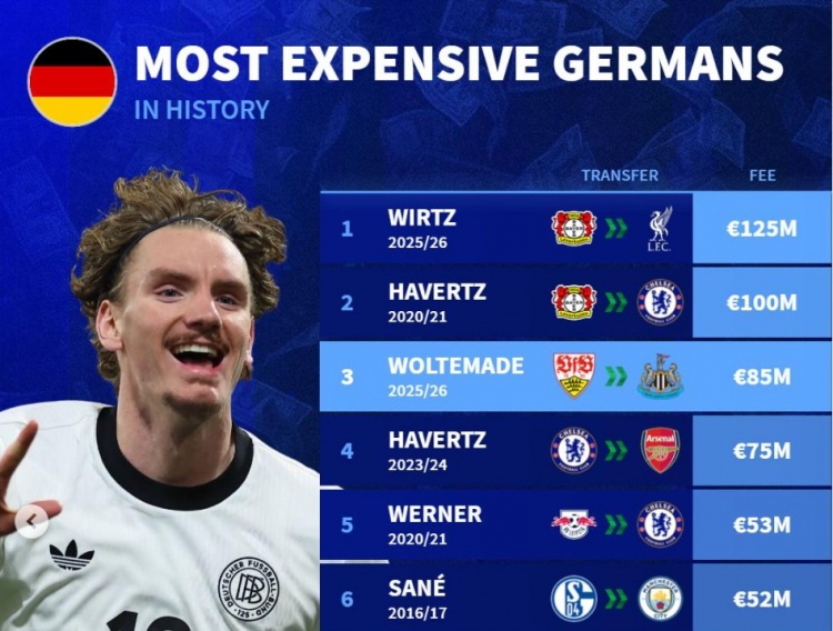 9月1日讯 沃尔特马德仍是官宣加盟纽卡斯尔,《转会市集》统计露出他亦然第5位转会费向上5000万欧元的德国球员(哈弗茨两次上榜)。
